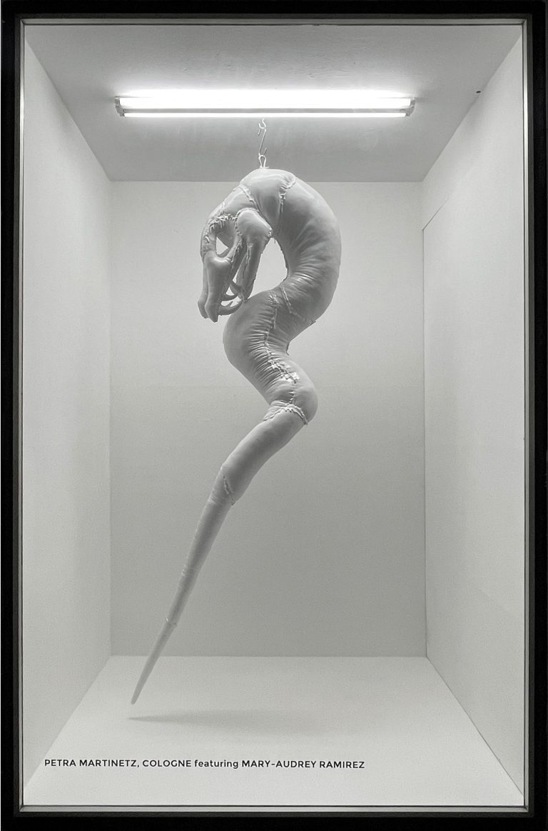 “Clone” hanging from the ceiling, consisting of a metal skeleton covered with vinyl and stuffed with fibers. In her latest works, Mary-Audrey Ramirez experiments with different techniques, materials, and textures, exploring their possibilities. What is real and what is not? In our increasingly digitized everyday lives, it is becoming more and more difficult to draw a clear line between the virtual and real worlds, between fantasy and reality. Deeply rooted in the gaming world, Ramirez creates a prototype video game from which the clone appears to have jumped directly into the EYESONY exhibition space and entered real life. Brought to life in the game, players move through cool, dreamlike ice landscapes, following a constellation of lights and gradually evolving into a spider-like creature. The boundaries between gaming and art, between virtual and real experience, become fluid. The objects printed on satin (clones) radiate the artificiality, glossiness, and slipperiness of fictional beings. Not only is working with computer programs essential to the artist’s practice, but so is working with fabrics and the sewing machine.